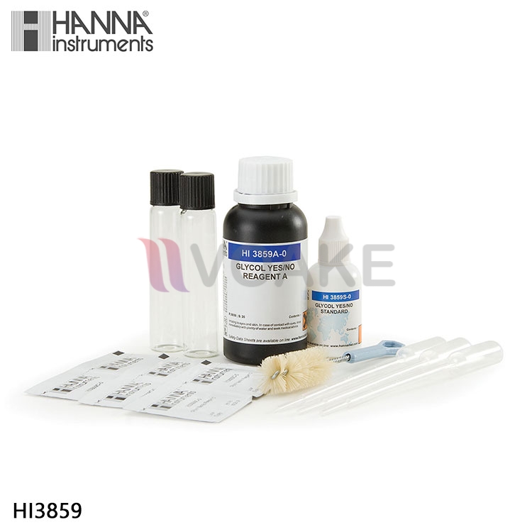 Ordering Information HI3859 test kit comes with 125 mL glycol reagent A, 25 packets glycol reagent B, 25 packets glycol reagent C, 25 mL glycol standard 0.025%, 3 mL plastic pipette, 1 mL plastic pipettes (25), 10 mL glass vials with caps (2), and brush.